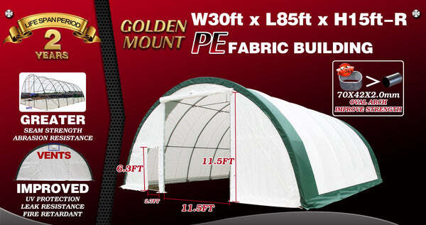 The Gold Mountain Single Truss Arch Storage Shelter W30’xL85’xH15’ is the perfect choice for anyone looking for a reliable and durable storage solution. This truss construction storage shelter is designed to be resistant towards water, UV, and fading, and can last up to 7-10 years under the right conditions. It features a freestanding style, mechanical doors at both ends, and a huge capacity for trucks, automobiles, and more bulk storage. This storage shelter will protect your belongings from wind, snow, and rain, and has a CSA/TUV Snow Rating Test Report and SGS fabric Certificate to guarantee its quality. Whether you need to store equipment, materials, or recreational items, the Gold Mountain Single Truss Arch Storage Shelter W30’xL85’xH15’ is the perfect choice.